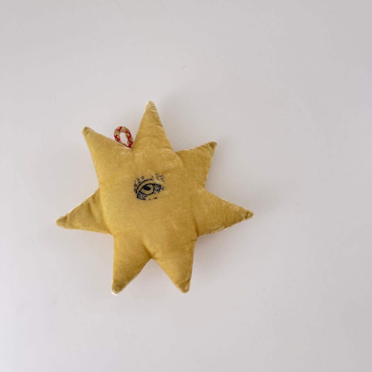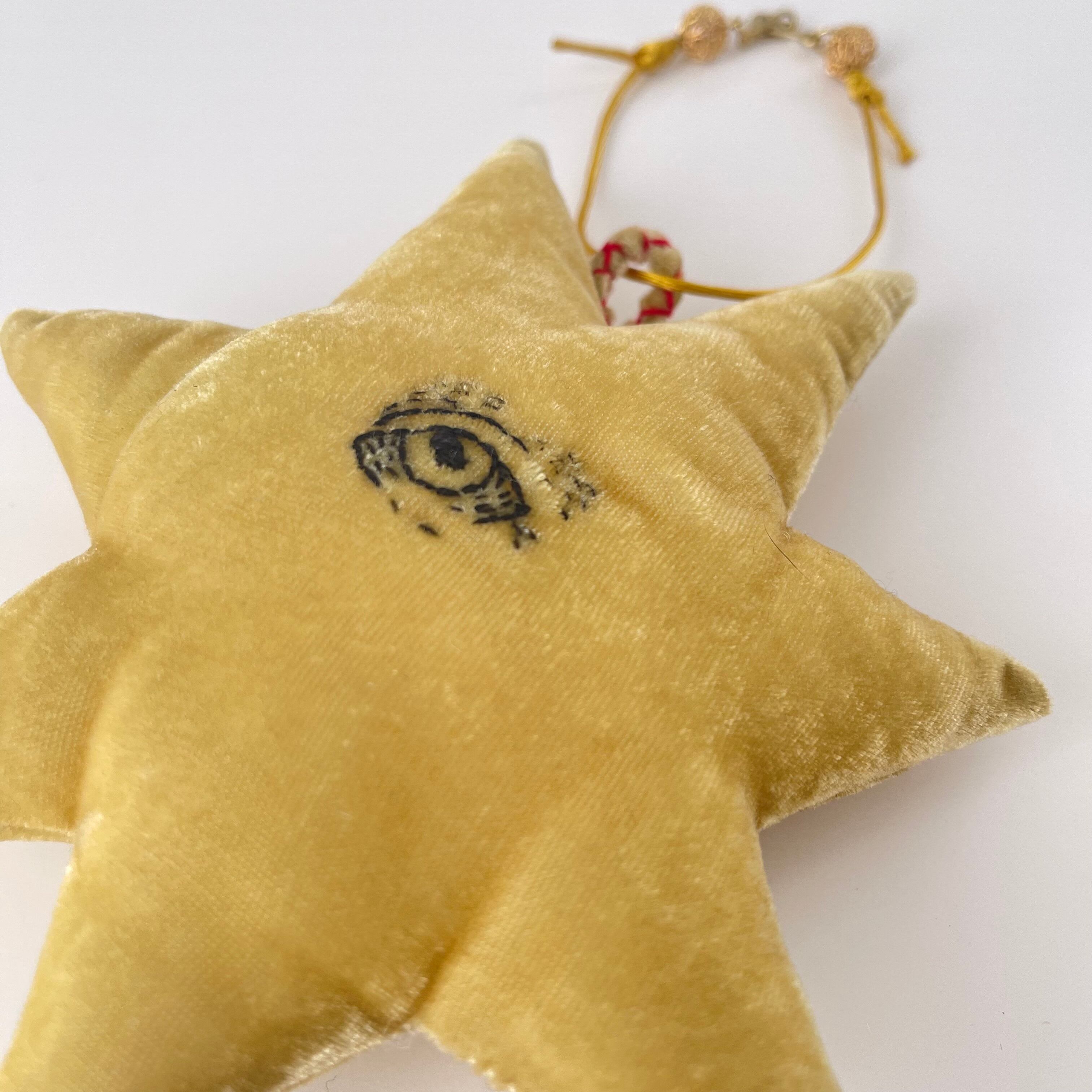 光沢のあるベルベット生地に瞳の刺繍が印象的なこのアイテムは猫のおもちゃとしても楽しめるチャームです。